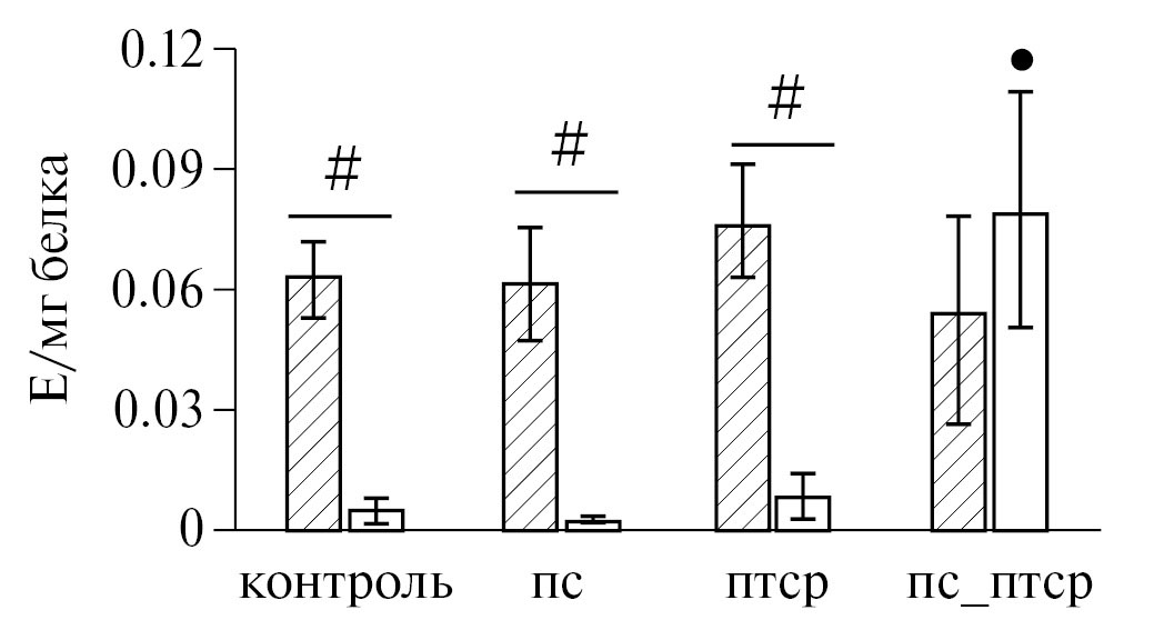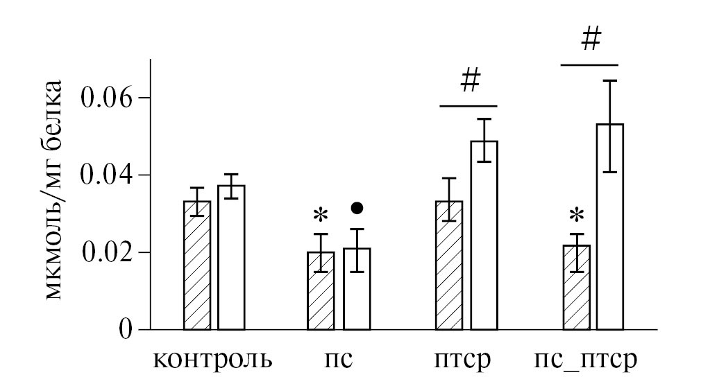 Рис. 7. Содержание восстановленного глутатиона в мозге у эмбрионов (самцы – заштрихованные столбики, самки – светлые столбики) в контроле и экспериментальных группах. * – статистически значимые отличия от контроля у эмбрионов-самцов p < 0.05; • – статистически значимые отличия от контроля у эмбрионов-самок; p < 0.05; # – статистически значимые межполовые различия, p < 0.05; данные представлены в виде среднее + стандартное отклонение