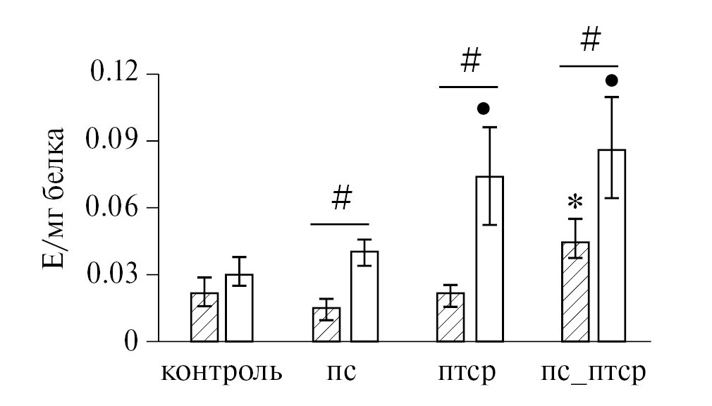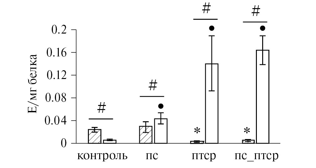 Рис. 4. Уровень ФОМБ первичных продуктов в мозге у эмбрионов (самцы – заштрихованные столбики, самки – светлые столбики) в контроле и экспериментальных группах. * – статистически значимые отличия от контроля у эмбрионов-самцов p < 0.05; • – статистически значимые отличия от контроля у эмбрионов-самок; p < 0.05; # – статистически значимые межполовые различия, p < 0.05; данные представлены в виде среднее + стандартное отклонение