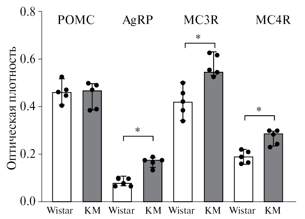 Результаты ПЦР в реальном времени демонстрируют (рис. 1), что в гипоталамусе крыс КМ по сравнению с крысами Wistar отсутствуют отличия между уровнем экспрессии Pomc (t = 0.45; p = 0.63). При этом у крыс КМ выявлено увеличение уровня мРНК AgRP (в 4 раза, t = 4.69, р < 0.05), мРНК MC3R (в 1.7 раз, t = 1.79, р = 0.07) и MC4R (в 2.4 раза, t = 4.03, р < 0.05) по сравнению с соответствующим показателем у крысы Wistar (рис. 1).