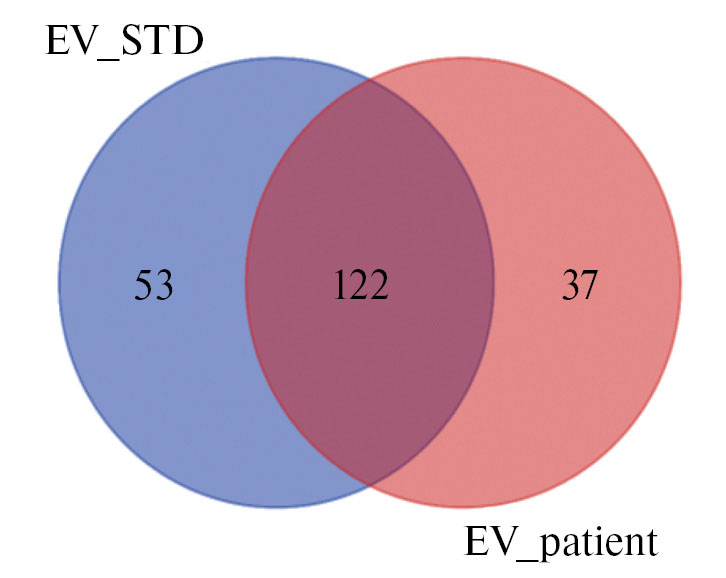 Рис. 1. Диаграмма Венна, демонстрирующая различие белкового состава образцов экзосом: стандарта HBM-PES-100 (n = 175), обозначенного как EV_STD, и образцов экзосом, выделенных из сыворотки крови пациентовEV_patient (n = 159)