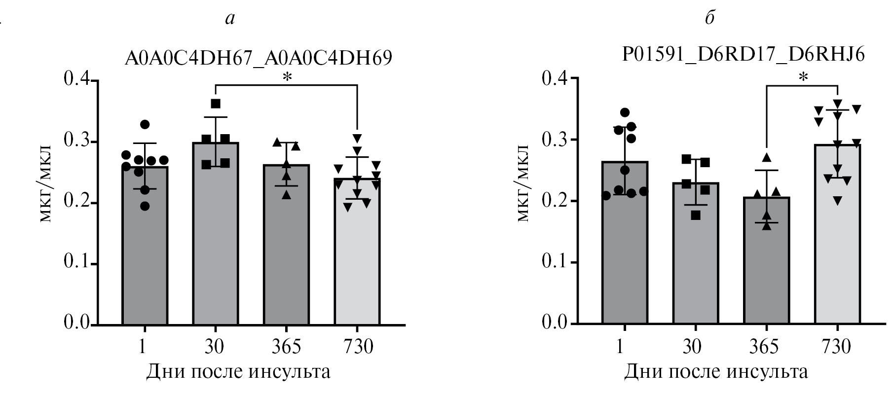 Выявленные достоверные различия при попарном сравнительном анализе уровней белков экзосом сыворотки крови групп пациентов на разных сроках после ИИ. При сравнении белковых профилей экзосом сыворотки крови пациентов, обследованных в первые сутки после ИИ и через месяц после ИИ, не было выявлено существенных различий в экспрессии белков.