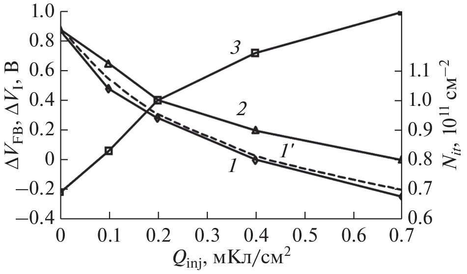 Изучено влияние режимов сильнополевой инжекции электронов на зарядовое состояние и дефектность МОП-структуры (металл–оксид–полупроводник) после радиационного облучения. Показано, что для стирания радиационно-индуцированного положительного заряда, накапливаемого в пленке SiO2 МОП-структур, необходимо использовать сильнополевую туннельную инжекцию электронов по Фаулеру–Нордгейму при электрических полях, не вызывающих генерацию дырок. Установлено, что стирание радиационно-индуцированного положительного заряда в пленке SiO2 МОП-структур и генерация новых поверхностных состояний в основном определяются величиной заряда, инжектированного в диэлектрик. Установлено, что при аннигиляции захваченных в SiO2 дырок в результате взаимодействия с инжектированными электронами наблюдается существенное увеличение количества поверхностных состояний, значительно превышающих количество поверхностных состояний, возникающих при отжиге радиационно-индуцированного заряда при комнатной температуре. Предложена модель, описывающая процесс аннигиляции радиационно-индуцированного положительного заряда при взаимодействии с инжектированными электронами.
