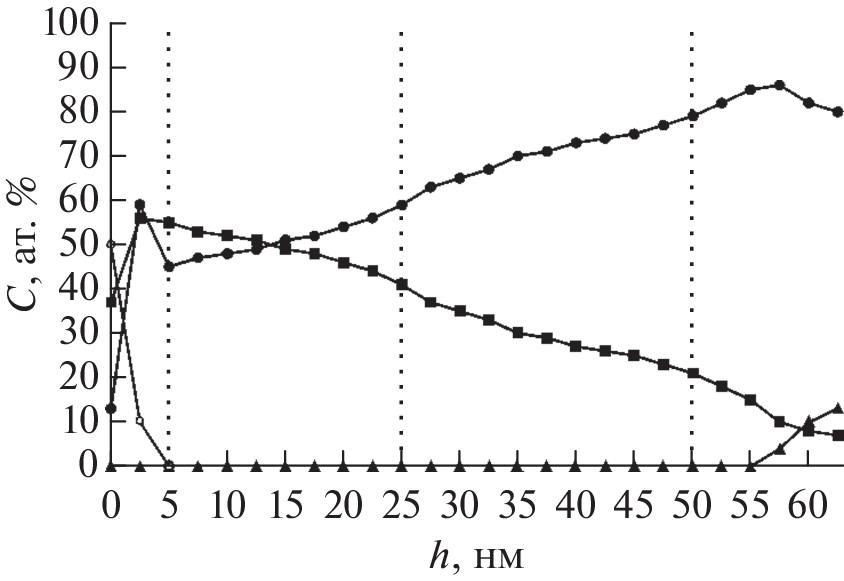 В настоящей работе проведена модификация поверхности сплава Н18 ионами аргона в импульсно-периодическом режиме. Методами электронной спектроскопии in situ проведено исследование изменений химического состава и локальной атомной структуры, вызванных ионным воздействием на поверхность. Химический состав был определен с помощью электронной оже-спектроскопии с использованием профилирования ионами аргона. Анализ локальной атомной структуры проведен методом спектроскопии протяженных тонких структур энергетических потерь электронов. Получены спектры возбуждения М2,3-края железа и K-края кислорода в геометрии обратного рассеяния от поверхности. Вариация энергии падающего электронного потока позволила получить сигнал от возбуждения атомов кислорода и железа с одинаковой глубины. Анализ экспериментальных данных проведен методом решения обратной задачи на нахождение парных корреляционных функций с использованием регуляризации по Тихонову. Исследование локальной атомной структуры проведено на глубине профилирования 5, 25 и 50 нм. Показано, что ионно-модифицированный слой в пределах проективного пробега ионов аргона состоит преимущественно из оксидов железа. На глубине профилирования 50 нм параметры локального окружения атомов Fe близки параметрам неокисленного железа. Никель в результате поверхностной диффузии обнаружен на глубине более 50 нм.
