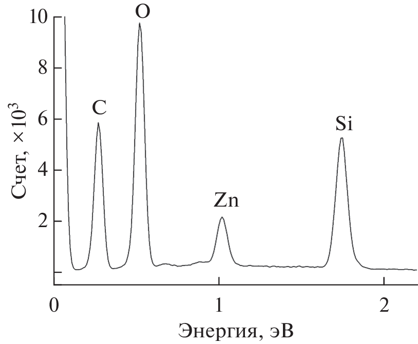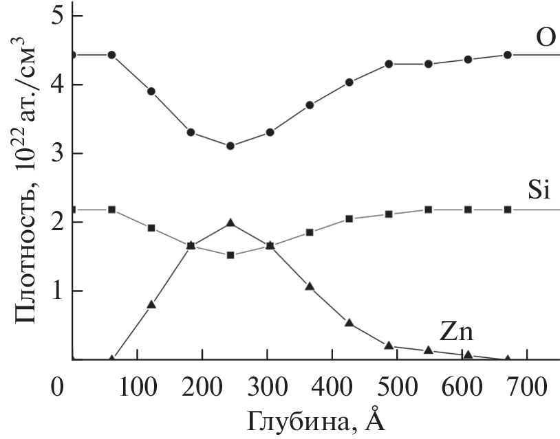 The results of the synthesis of nanoclusters of metallic zinc and its oxide in crystalline quartz implanted with 64Zn+ ions with a dose of 5 × 1016 cm–2 and energy of 40 keV and annealed in an oxygen atmosphere in the temperature range 400–900°C are presented. Scanning electron microscopy combined with energy-dispersive spectroscopy, as well as Auger electron spectroscopy and photoluminescence, were used for the study. After implantation, separate nanoclusters of metallic zinc with a size of less than 1 µm were fixed on the surface and in the near-surface layer of quartz. It was established that, during annealing, the sample underwent a transition from the phase of metallic Zn to the phases of its oxide ZnO and silicate Zn2SiO4. After annealing at 700°C, which is the most optimal for obtaining the ZnO phase, zinc oxide nanoclusters smaller than 500 nm in size were formed in the near-surface layer of quartz. A peak in the form of a doublet at a wavelength of 370 nm was observed in the photoluminescence spectrum due to exciton luminescence in zinc oxide. After annealing at 800°C, the ZnO phase degraded and the zinc silicate phase Zn2SiO4 was formed.