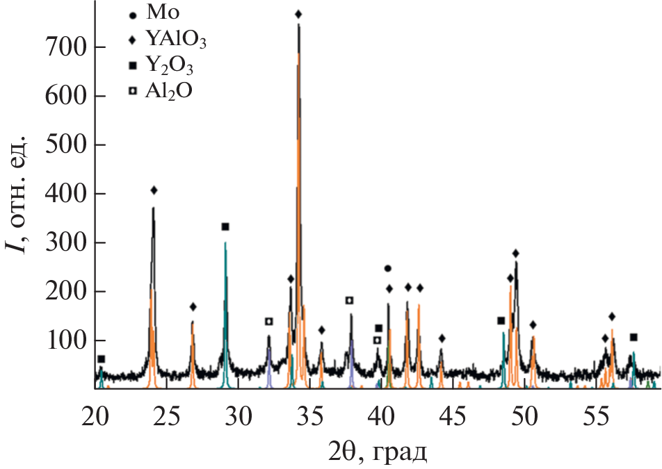 Y–Al–O thermal barrier coating was investigated using synchrotron radiation. Y–Al–O coating was deposited on molybdenum substrate using cathodic-arc deposition with two elemental cathodes made from aluminum and yttrium respectively. Phase evolution was investigated during samples heating up to 1500°C in vacuum. It was found that as-deposited coating has amorphous structure and crystallization process take place at 1160–1170°C, no another phase transformations was observed. Qualitative phase composition of coating as well as microstresses in film were determined. The results of evaluation demonstrates lack of microstresses in obtained coating. Obtained results demonstrates a possibility of Y–Al–O coating deposition by cathodic arc deposition Arc-PVD technology, and deposited coating consist of YAlO3 (predominantly), Y2O3 oxides and YAl2 intermetallic.