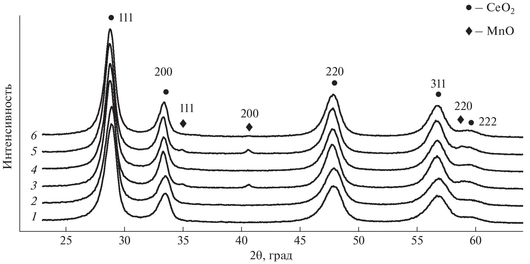 A series of MnOx–CeO2 catalysts with a molar ratio of Mn : Ce = 3 : 7 was prepared by co-precipitation method and futher calcination at temperatures ranged from 300 to 800°С. As prepared catalysts were characterized by powder X-ray diffraction, low-temperature nitrogen adsorption, X-ray photoelectron spectroscopy, and the catalytic activity in the CO oxidation reaction was tested for all samples. It has been shown that a (Mn,Ce)O2 solid solution with the fluorite structure is formed for all catalysts. Based on the studies performed, a catalyst obtained at calcination temperature of 600°С was chosen for further studies of the effect of redox exsolution on the catalytic activity in the CO oxidation reaction by operando X-ray diffraction. The experiment was carried out sequentially in a stepwise manner: stepwise heating/cooling in the reaction mixture 1% CO + 2% O2 at temperatures of 150–175–200–175–150°C (stages 1, 3, and 5); reduction of the sample in a mixture of 10% CO + He at 400°C (stage 2); reduction of the sample in a mixture of 10% H2 + He at 400°C (stage 4). It was shown that the reductive pretreatment leads to phase segregation of the initial (Mn,Ce)O2 solid solution and the appearance of dispersed manganese oxides on the surface. In turn, enrichment of the surface with manganese oxide leads to an increase of the activity in the CO oxidation reaction.