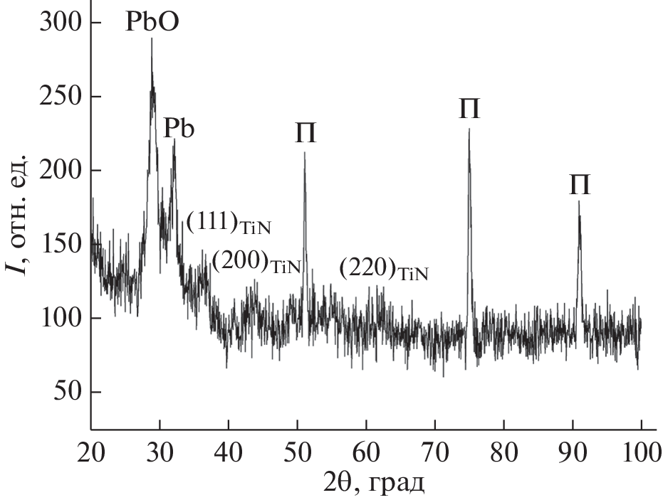 Сomposite solid lubricating coatings TiN–Pb with a thickness of ~2 μm were produced by co-sputtering of Ti and Pb cathodes of two separate magnetrons on titanium alloy VT6. The Pb content in the coating averages ~12 at. %. The inner layer is coating characterized by a uniform distribution of Pb, and the upper layer is characterized by the presence of islands with a high content of Pb. The coating structure is globular, predominantly containing nanometer-sized crystallites. The absence of a columnar structure of the coating is associated with a high content of Pb, which is insoluble in the TiN matrix and interrupts the growth of crystallites. X-ray diffraction analysis showed the presence of Pb, PbO, and TiN phases in the coatings. The diffraction lines are broadened, which indicates that the crystallite size is ~10–20 nm in the coating. Tribological tests of the TiN–Pb coating were carried out under conditions of low-amplitude friction – fretting wear in a wide range of loading parameters. In the full slip mode, a friction coefficient of ~0.25 is observed. During the transition from the full slip mode to the reciprocating slip mode, the energy dissipated during friction drops by more than three times, which is also reflected in a sharp decrease in the friction coefficient from 0.25 to 0.05.