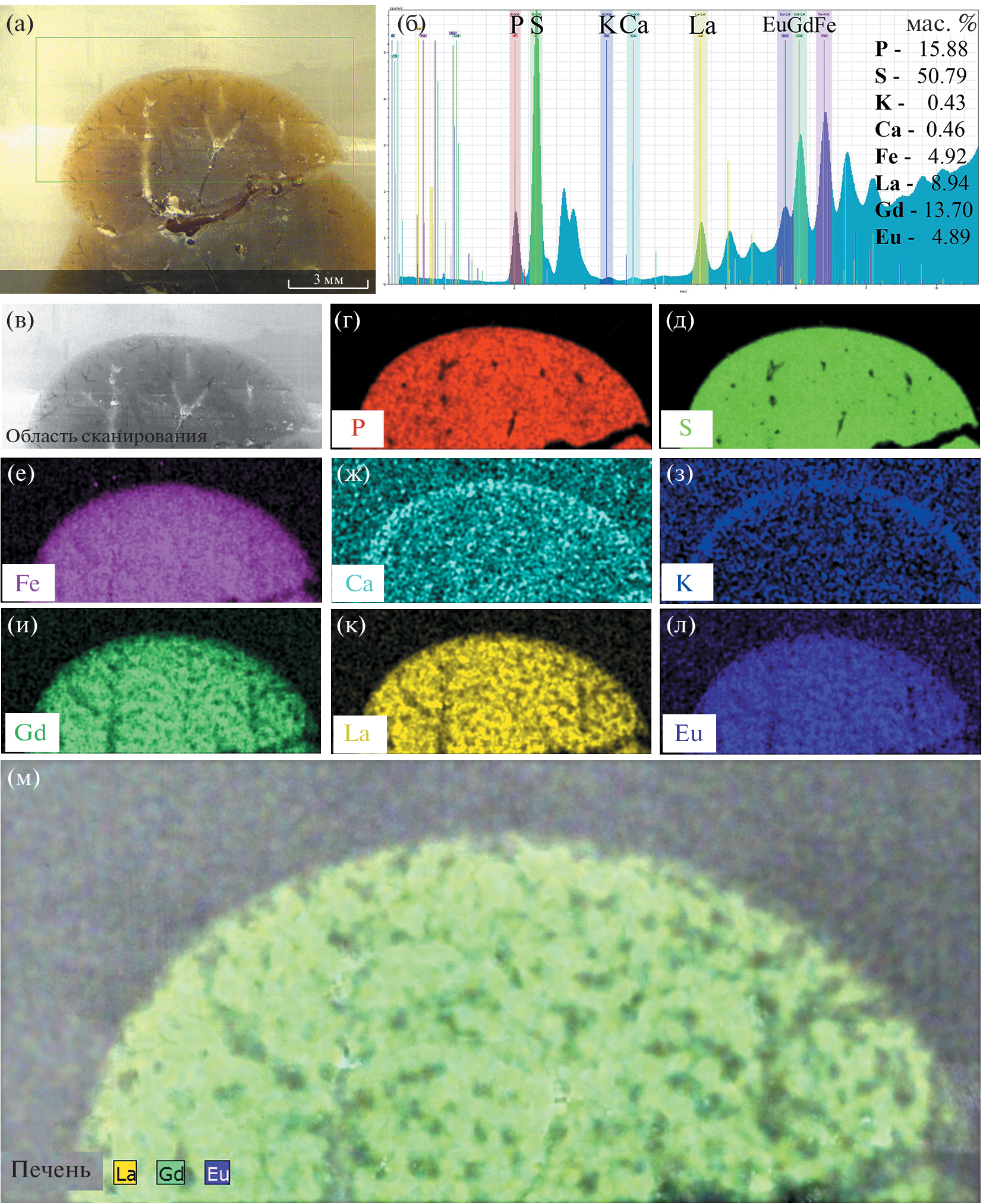 The biodistribution of Gd0.5La0.5F3:Eu(15%) X-ray phosphor nanoparticles in the body and tissues of internal organs of balb/c laboratory mice was studied. Gd0.5La0.5F3:Eu(15%) nanoparticles were obtained by the hydrothermal synthesis at 250°C for 24 h. Using X-ray powder diffraction, transmission electron microscopy, and dynamic light scattering, it was shown that a hexagonal phase was formed in the resulting sample, and the average size of nanoparticles varied in the range 30–40 nm. In vivo experiments have shown that intravenous administration of an aqueous solution of nanoparticles accumulates the sample mainly in the liver and spleen, with the maximum concentration being reached during the first day. According to the results of post-mortem analysis of tissues by micro-CT, it was shown that these nanoparticles formed conglomerates, their distribution over the volume of the organ was homogeneous. X-ray fluorescent analysis of liver and spleen tissue fragments allowed for elemental analysis and mapping. Distribution maps of heavy elements in the composition of nanoparticles (Gd, La, Eu) were similar to Fe distribution maps, which indicated the uniform distribution of Gd0.5La0.5F3:Eu(15%) nanoparticles in the pulp of the internal tissues of the liver and spleen.