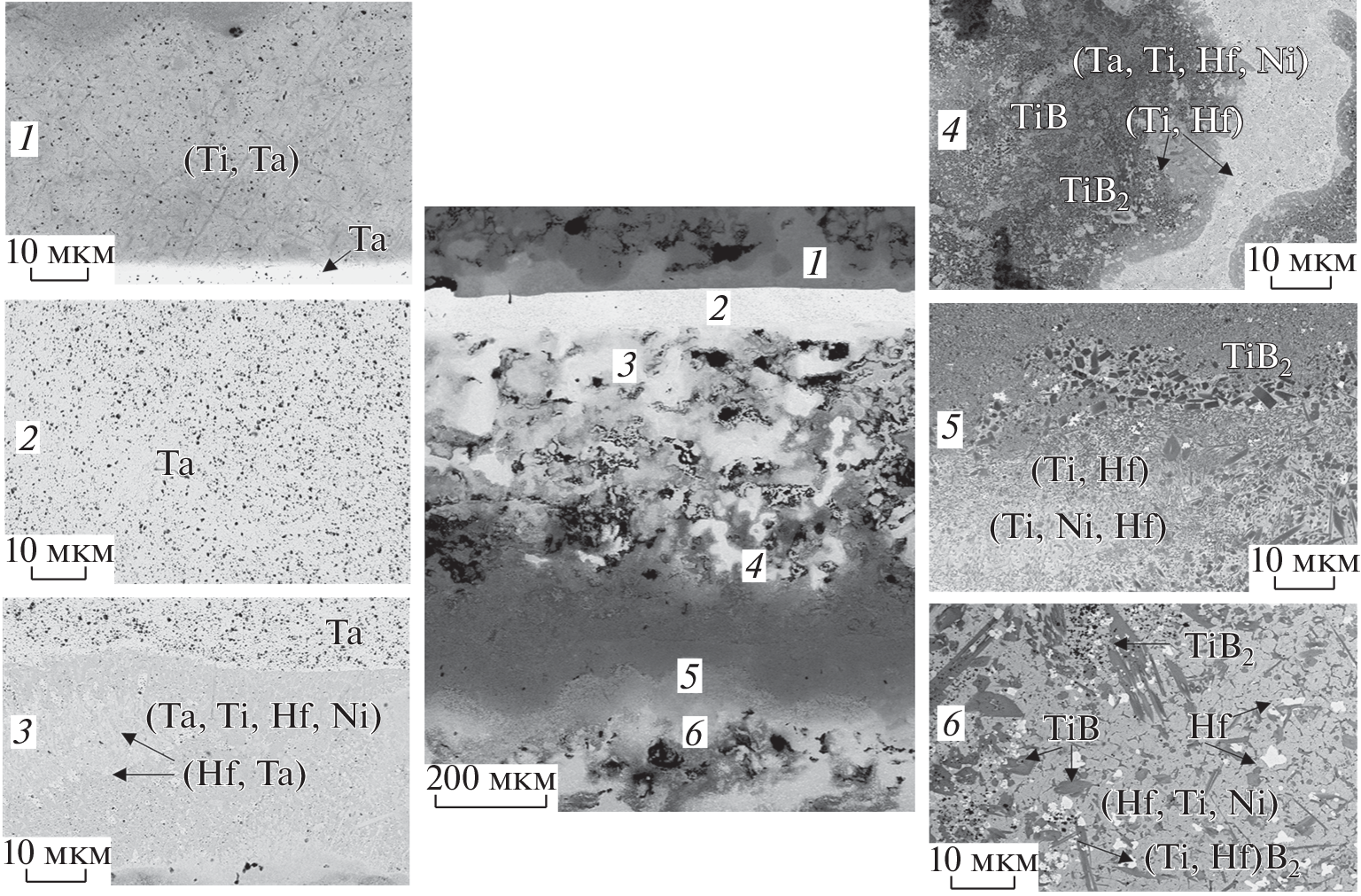 Layered composite materials Ti/Ta/Hf/ ceramic were produced via self-propagating high-temperature synthesis (SHS) of pre-structured samples using metal foils (Ti, Hf, Ta, Ni) and reaction tapes (Ti + 0.65C), (Ti + 1.7B) and (5Ti + 3Si). Reaction tapes were prepared by cold rolling from powder mixtures. The microstructure, elemental and phase compositions of the synthesized multilayer composite materials were characterized by Scanning Electron Microscopy (SEM) and X-ray analysis. Their flexural strength was determined according to the scheme of three-point loading at temperatures of 25 and 1100°С. The microstructure analysis of produced materials showed that the joining in the combustion mode of metal foils and reaction tapes is provided due to reaction diffusion, mutual impregnation and chemical reactions occurring in reaction tapes and on the surface of metal foils. The formation of thin intermediate layers in the form of cermets and eutectic solutions provides the synthesized multilayer materials with good strength properties (up to 275 MPa at 25°С, up to 72 MPa at 1100°С). These results are of interest for the development of construction materials operating under extreme conditions.