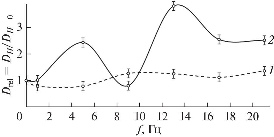 Экспериментально исследовано влияние импульсного магнитного поля на коэффициент объемной диффузии Sn в α-Fe в диапазоне амплитуд напряженности поля 79.6–398.0 кА ⋅ м–1, в интервале частот 1–21 Гц при температуре 790 и 830°C. Рентгенографическим методом установлено существенное влияние магнитного поля на коэффициент диффузии Sn в α-Fe при температуре 790°C. Наблюдаемое поведение частотной зависимости коэффициента диффузии носит выраженный “резонансный” характер. Обсуждается степень влияния константы магнитострикции α-Fe в парамагнитной области на дополнительный массоперенос при воздействии магнитного поля. Дается теоретическое обоснование предположения о связи “резонансного” поведения коэффициента диффузии и явления торможения дислокаций атмосферой Коттрелла в условиях воздействия импульсного магнитного поля. Отмечена значительная роль взаимодействия упругих полей комплексов дефектов с полями магнитострикционных напряжений α-Fe.
