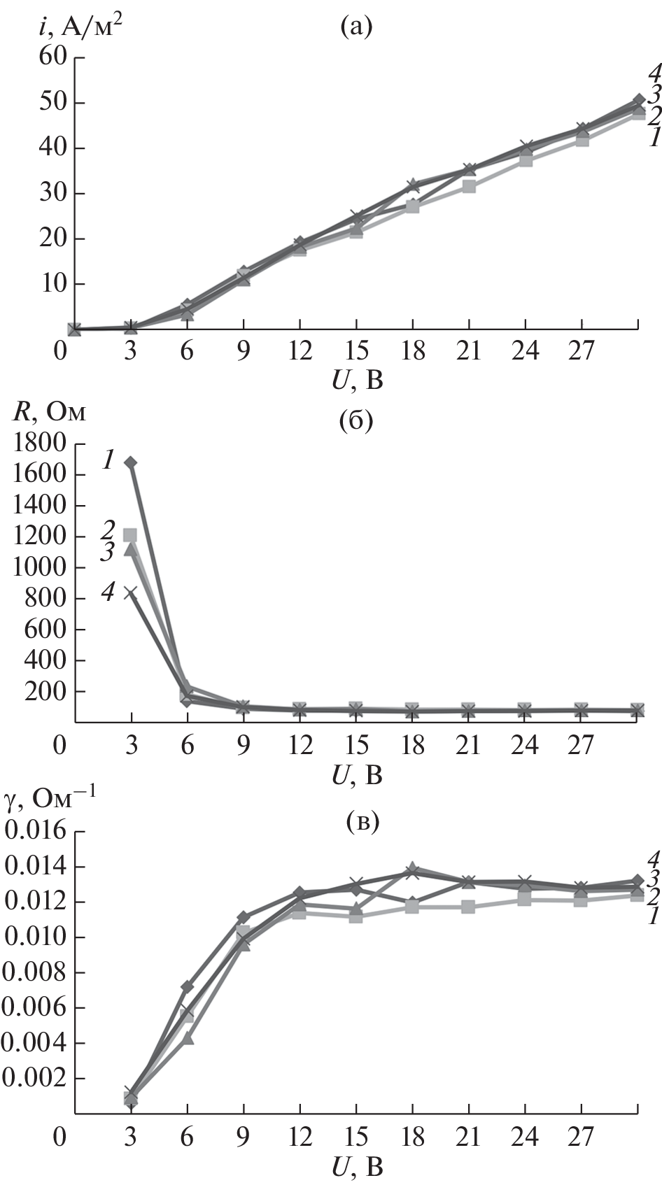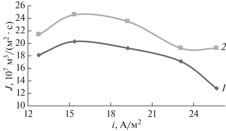 The absorption spectra of infrared radiation by membranes of the AMN-P and OPMN-P brands are analyzed. In the spectra of the surface layer of the AMN-P membrane, there is a decrease in the relative intensity of the frequencies of the carbonyl group (1724, 3392 cm–1 for air dry). For the cellulose acetate AMN-P membrane, the number of hydrophilic OH groups increases, which changes its molecular structure and transport characteristics. In the infrared radiation spectra of the surface layer of the OPMN-P membrane, the 1650–1670 cm–1 band characteristic of C=O group shows changes in the frequency of the spectrum: for air-dry and water-saturated samples, it shifts from 1652 to 1666 cm–1, respectively. Interactions of carbonyl (C=O) and amide (H–N) groups form the supramolecular structure of polyamides. Changes in the infrared radiation spectrum of the water-saturated sample of the OPMN-P membrane can be explained by the fact that the C=O…–…H–N bonds of the amide fragment do not break. Therefore, membrane swelling partially affects the structural rearrangement of the polyamide at the supramolecular level. In the electron nanofiltration separation of an aqueous solution of ammonium chloride, two intervals of change in the specific output flux are noted at fixed transmembrane pressure and experiment time. The first period occurs at a current density of 12.82 to 15.38 A/m2 and is associated with the penetration of the solvent with a slight gas formation on the electrodes. The second period is observed from 15.38 to 25.64 A/m2 and is associated with membrane degradation and intense gas formation, especially chlorine. It is noted that in the intermembrane channels the migration of cations and anions is affected by the processes of throttling, heat release, when operating in the limiting mode (when current carriers – H+ and OH–) appear, which is confirmed by the data of studies of the electrochemical parameters of the membrane system.