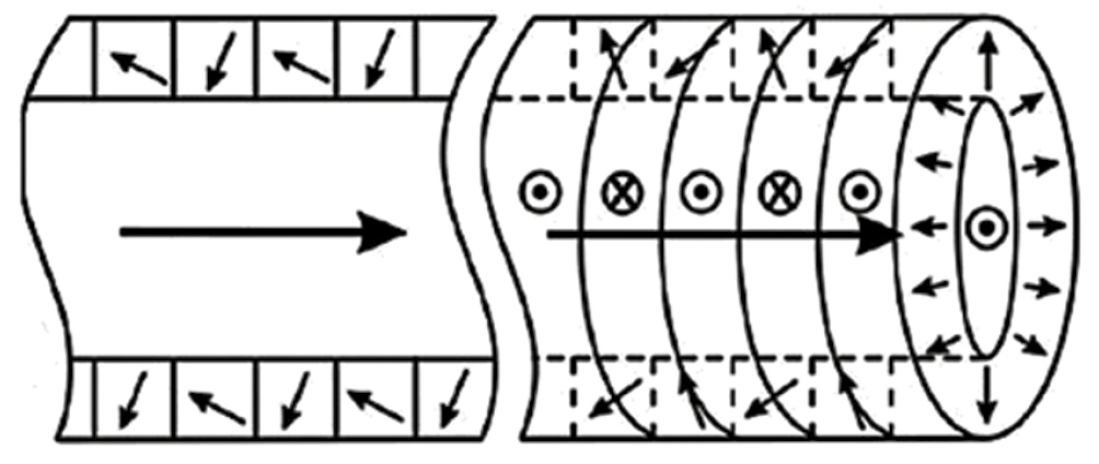 Управление магнитными свойствами аморфных ферромагнитных сплавов является перспективной задачей, позволяющей создавать новые типы магнитных материалов для современных датчиков. Известно, что напряженное состояние аморфных микропроводов, полученных методом Улитовского–Тейлора, является неоднородным по сечению и компонентам тензора напряжения. Центральная часть микропровода находится в растянутом состоянии, а величина напряжений по всем компонентам тензора деформации составляет сотни МПа. В то же время поверхностная часть микропровода оказывается в поле действия сжимающих напряжений вплоть до нескольких ГПа по касательной и осевой компонентам [1]. Такие напряжения в совокупности с цилиндрической геометрией микропровода приводят к формированию композиционной магнитной доменной структуры. В случае проводов с положительной магнитострикцией данная структура состоит из доменов центрального слоя с ориентацией магнитного момента вдоль оси микропровода и доменов поверхностного слоя с радиальной ориентацией магнитных моментов. Принятый в литературе вид такой структуры представлен на рис. 1.