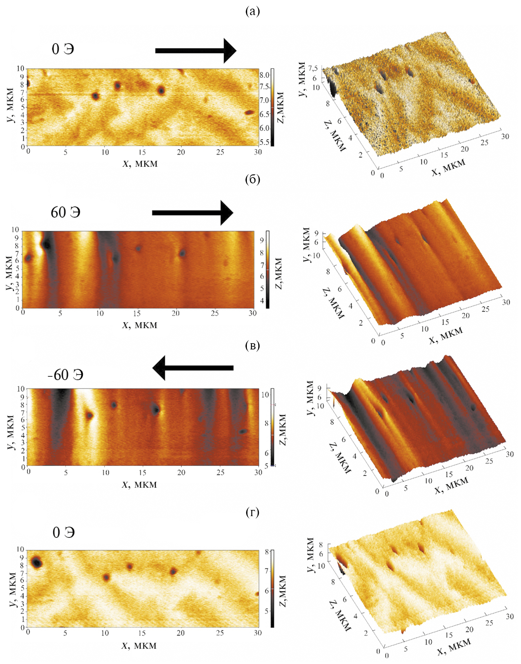 Как видно из рис. 4а, 4г, изображения в отсутствие магнитного поля характеризуются наклоном момента в темных и светлых доменных областях на угол 45° или 135° относительно оси провода. Форма наблюдаемой структуры близка к зигзагообразной, однако доменные области искажены и имеют непостоянную ширину 3–5 мкм. Как и в случае, показанном на рис. 3, темным и светлым областям соответствуют домены с противоположной ориентацией магнитного момента. Также важно заметить, что доменная структура, наблюдаемая на рис. 4а, 4г, не является идентичной. То есть перемагничивание образца не приводит к сохранению исходной доменной структуры после удаления магнитного поля.