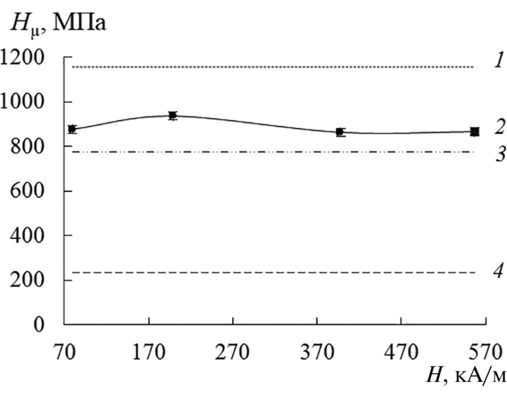 Рис. 1. Зависимость микротвердости алюминиевого сплава Al–Si–Cu–Fe от амплитуды напряженности импульсного магнитного поля: 1 – Н = 0; 2 – Н ≠ 0; 3 – после закалки; 4 – микротвердость Al.