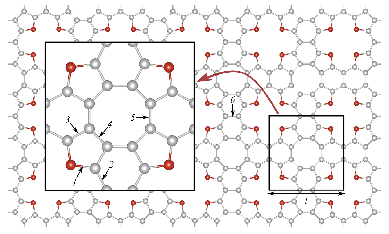 Рис. 1. Атомная структура ячейки моделирования монослоя тетраоксо[8]циркулена. Атомы углерода обозначены серым цветом, атомы кислорода – красным. Границы ячейки моделирования отмечены черной сплошной линией. Все изображения структур получены с помощью программного пакета VESTA 3. Длины связей после оптимизации геометрии в пакете VASP (в скобках – значения после оптимизации в SIESTA): 1 – 1.38 (1.39); 2 – 1.41 (1.42); 3 – 1.40 (1.40); 4 – 1.42 (1.43); 5 – 1.41 (1.41); 6 – 1.46 (1.46) Å.
