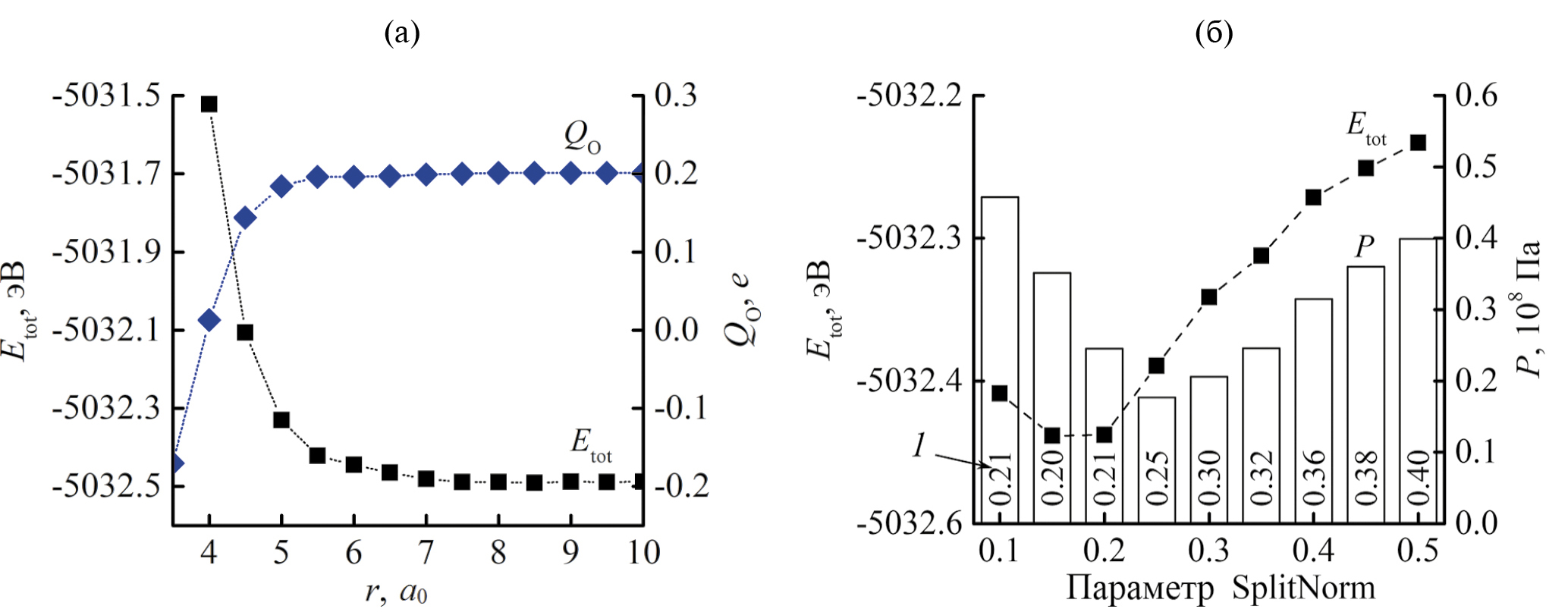 Рис. 2. Зависимости полной энергии ячейки монослоя тетраоксо[8]циркулена Etot, параметра P и заряда, перешедшего на атом кислорода QO от: (а) радиуса обрезки r орбитали О2p; (б) параметра SplitNorm (задает радиус обрезки rm модифицированной орбитали). Заряд кислорода приведен у основания столбцов (1). a0 = 0.529 Å.