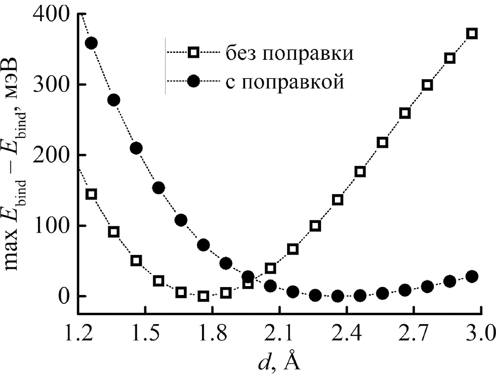 Рассмотрим подробно моделирование сорбции водорода в АО-базисе с параметрами, установленными по умолчанию, на примере одной конфигурации системы, когда молекула H2 располагается над порой, образованной атомами кислорода (конфигурация О1) в приближении Пердью–Берка–Эрнзерхофа с учетом поправки Гримме второго поколения (PBE+D2). Сначала проводили стандартную оптимизацию геометрии по силовому критерию (табл. 1). Затем полученную конфигурацию всех атомов TOC фиксировали и вручную изменяли только расстояние водород–TOC с шагом 0.05 Å как в большую, так и в меньшую сторону от полученного после оптимизации значения. На каждом шаге не проводили какой-либо релаксации структуры (иначе бы атомы вернулись к исходной конфигурации) и вычисляли энергию связи водорода по формуле (1) для двух случаев: с учетом и без учета поправки Бойса–Бернарди (для построения зависимости без учета поправки считали ECP = 0 эВ). Полученные зависимости энергии связи от расстояния d между центром молекулы H2 и монослоем TOC без и с учетом поправки Бойса–Бернарди представлены на рис. 3. Расстояние, соответствующее минимуму зависимости с рис. 3, и будет равновесным расстоянием для использованного метода подсчета энергии связи (с учетом поправки и без). Видно, что без учета поправки к ошибке суперпозиции базисного набора расстояние d получилось на 0.6 Å меньше, что составляет более 30% от этого значения d. Очевидно, что нельзя игнорировать ошибку суперпозиции базисного набора и при расчете геометрических характеристик слабосвязанных систем. По зависимости Ebind(d) можно также оценить погрешность, с которой определено расстояние d после учета поправки Бойса–Бернарди. Если погрешность вычисления энергии связи ΔEbind ~ 1 мэВ, тогда такое изменение энергии произойдет в Ebind(d) на расстоянии Δd от минимума, равном примерно 0.1 Å для данных, показанных на рис. 3.