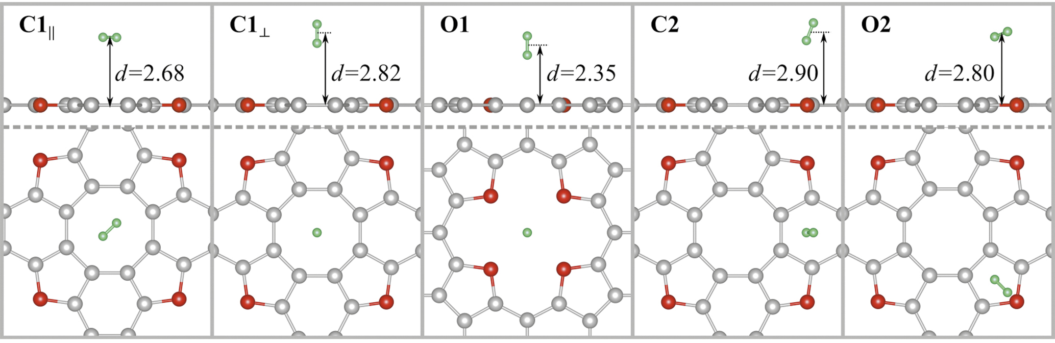 Сначала наиболее устойчивые конфигурации молекул водорода были получены в ПВ-базисе. Соответствующие структуры, смоделированные в приближении PBE+D2, представлены на рис. 4. Затем эти конфигурации были использованы в качестве стартовых для расчетов в пакете SIESTA (с приближениями PBE+D2 и vdW-BH для ОКФ). После оптимизации геометрии в приближении PBE+D2 сохранились все рассмотренные конфигурации молекул водорода при использовании и базиса по умолчанию, и оптимизированного базиса (менялась только величина d). В приближении vdW-BH конфигурация С1⊥ перешла в С1||, а в базисе по умолчанию, кроме этого, конфигурация О2 перешла в О1. Вычисленные энергии связи и расстояния между монослоем TOC и водородом в пакете SIESTA приведены в табл. 3. Для всех приведенных конфигураций погрешность вычисления расстояния после учета поправки Бойса–Бернарди к геометрии составила Δd ≈ 0.1 Å.
