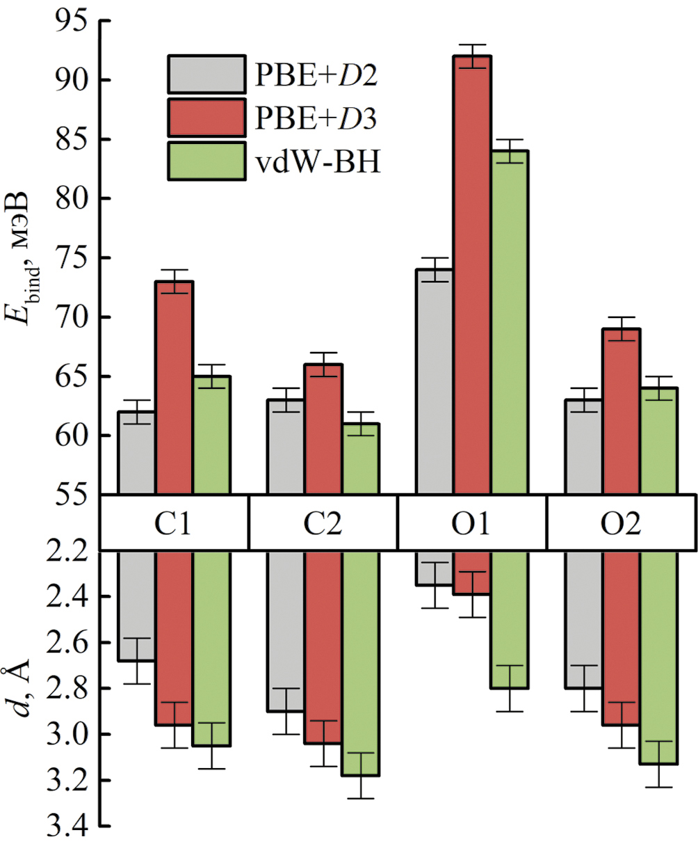 Сравним теперь результаты, полученные с помощью различных поправок на дисперсионное взаимодействие. Поскольку в приближении PBE+D2 величины энергий связи и расстояний, вычисленные с помощью АО- и ПВ-базисов, практически совпадают после оптимизации базиса и учета поправки Бойса–Бернарди в энергии и геометрии, для дальнейшего анализа мы использовали результаты расчетов в пакете VASP. Итоговые результаты представлены на рис. 5. Конфигурация С1⊥ была исключена из рассмотрения, т.к. в расчетах с полуэмпирическими поправками она имела минимальную энергию связи, а при использовании аналитического функционала оказалась неустойчивой и переходила в С1||. На рис. 5 обозначение С1 соответствует конфигурации С1||.