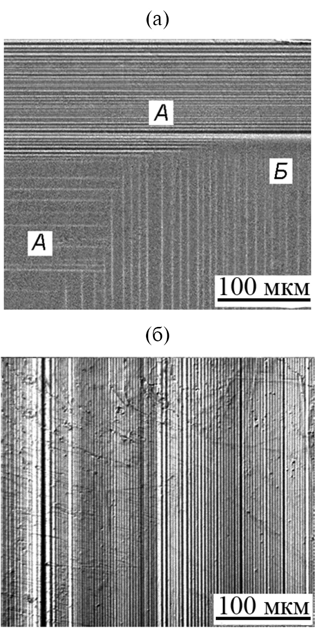На начальном этапе области с ромбической фазой, ориентированные вдоль разных кристаллографических направлений (рис. 2а, области А и Б), образуют макродомены. Их расположение в кристалле еще не установилось. Можно наблюдать, как в процессе образования ромбической фазы одни макродомены вытесняют другие. По мере понижения температуры зародившиеся домены уплотняются, а затем при снижении в пределах полуградуса между ними проскакивают домены со второй возможной в плоскости ab ориентацией осей. При этом происходит коррекция направлений доменов, и они располагаются под углом 90° друг к другу. Таким образом, формируется сплошная двойниковая структура, проявляющаяся в виде чередующихся вертикальных темных и светлых полос шириной 1–10 мкм (рис. 2б), и при дальнейшем понижении температуры их положение практически не меняется. Следует отметить, что положение двойников, их плотность и ориентация в любой области кристалла достаточно случайны: при циклировании нагрева и охлаждения картина не воспроизводится.