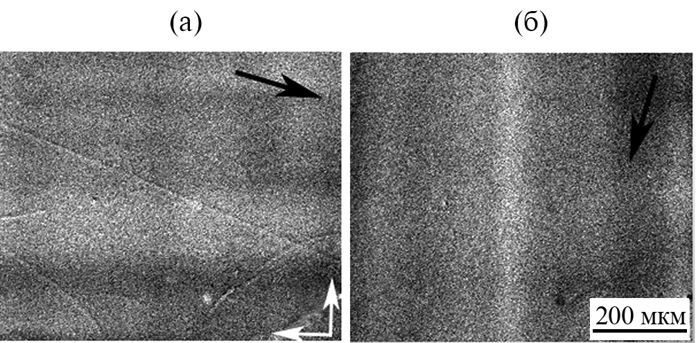 Рис. 6. Трансформация при Т = 8 К макроскопической модуляции напряжений под действием магнитного поля Н = 50 Э, лежащего в плоскости ab и приложенного под углом около 20° (а) и 70° (б) к двойниковым границам (направление поля показано черными стрелками, направление кристаллографических осей в тетрагональной фазе – белыми стрелками).