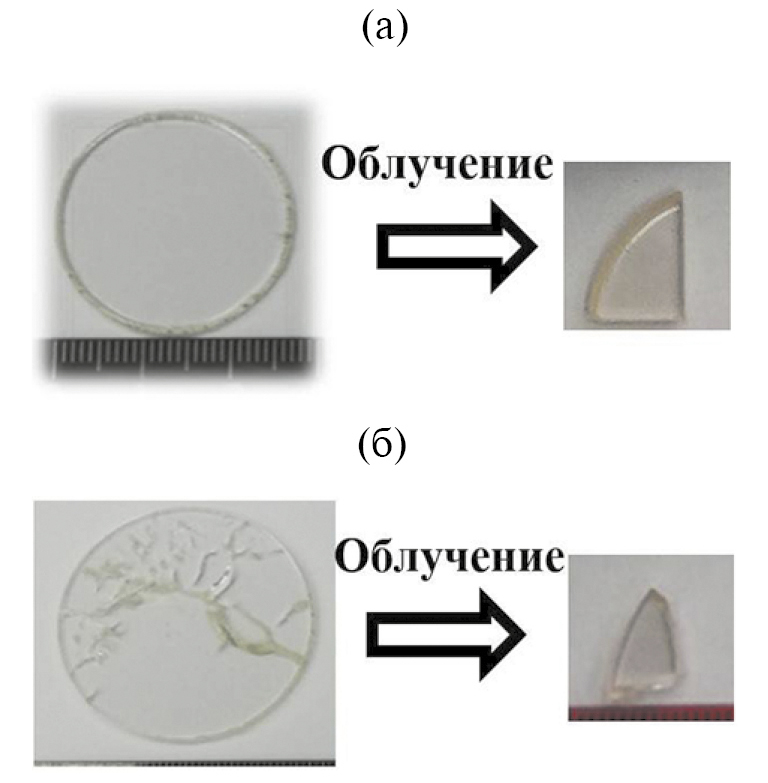 Рис. 1. Внешний вид исследуемых кристаллов Gd3Al2Ga3O12 (а) и Gd3Al3Ga2O12 (б) до и после облучения протонами.