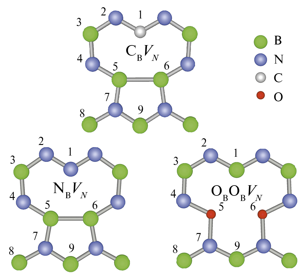В поисках дефектных структур, способных сыграть роль источников одиночных фотонов, большое значение имеют методы компьютерного моделирования из первых принципов, позволяющие если не найти эти структуры, то отсеять структуры, явно непригодные для этой роли. За последнее время таким способом были исследованы собственные точечные дефекты и их комплексы [15, 16], примеси углерода и их комплексы [17–20], а также примеси кислорода, водорода [15] и кремния [21]. Анализ этих данных показал, что наиболее вероятными источниками одиночных фотонов являются дефекты CBVN, NBVN и OBOBVN [22] (запись CBVN означает, что этот дефект получается заменой атома бора (B) на атом углерода (C) и атома азота (N) на вакансию (V); по тем же правилам именуются и оставшиеся дефекты).