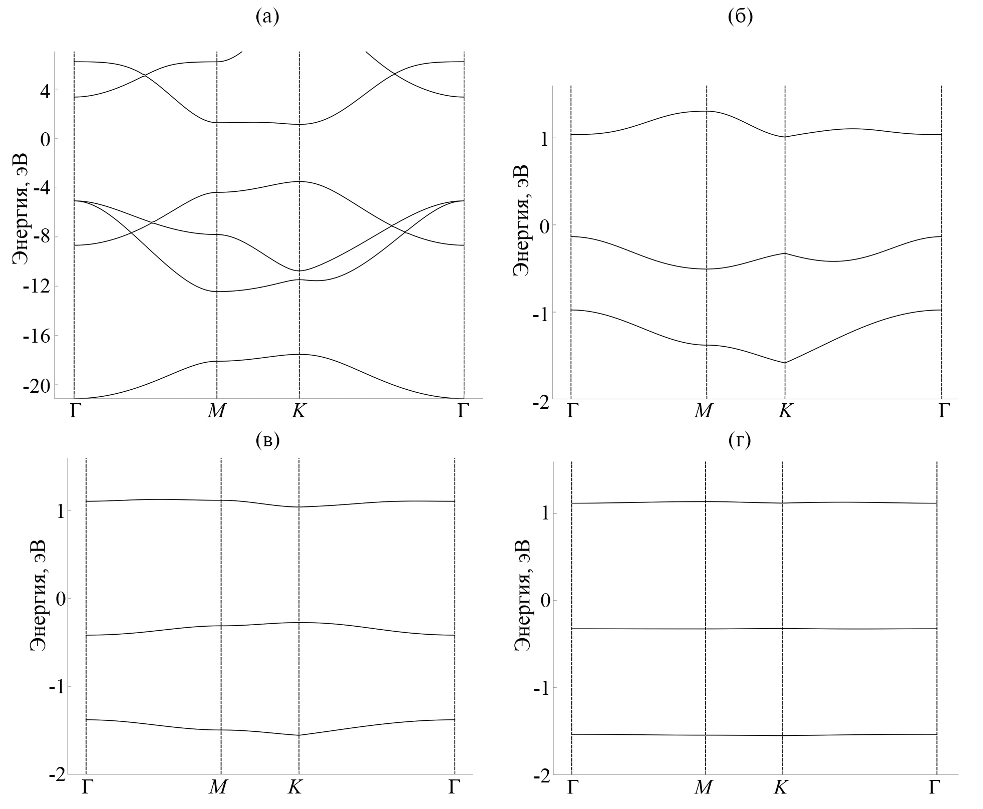 Рис. 2. Зонные структуры элементарной ячейки h-BN (а) и CBVN при различных размерах модели: 3 × 3 (б); 4 × 4 (в); 6 × 6 (г). Спин вверх, SIESTA. Энергия отсчитывается от уровня Ферми.