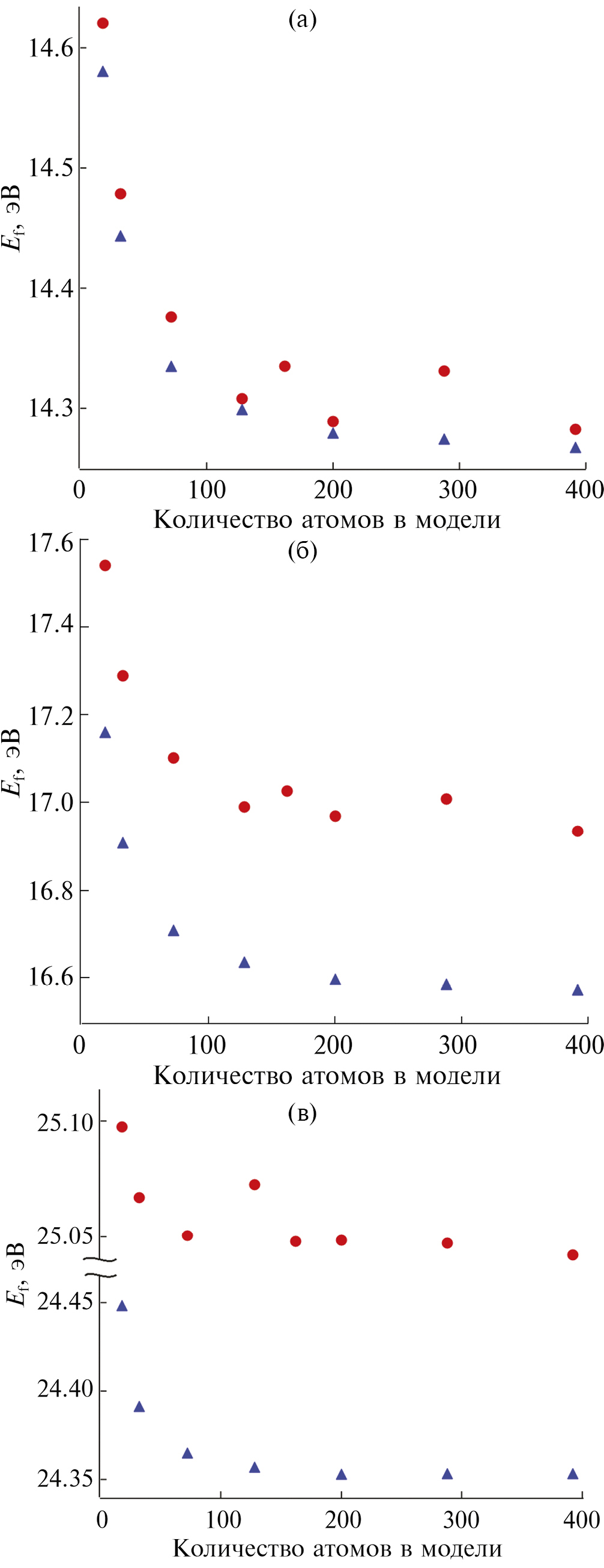 Рис. 3. Зависимость энергии образования дефекта CBVN (а), NBVN (б) и OBOBVN (в) от количества атомов в модели: кружками отмечены результаты SIESTA, треугольниками – VASP.