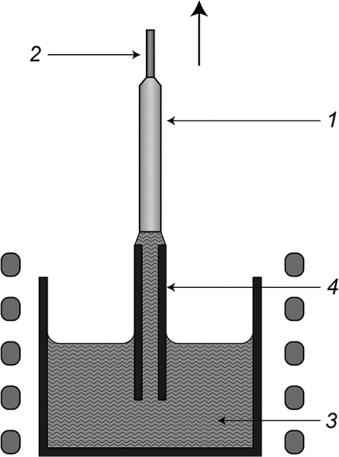 Рис. 1. Схема выращивания сапфирового волокна методом Степанова/EFG: 1– кристалл; 2 – затравка; 3 – расплав; 4 – формообразователь.
