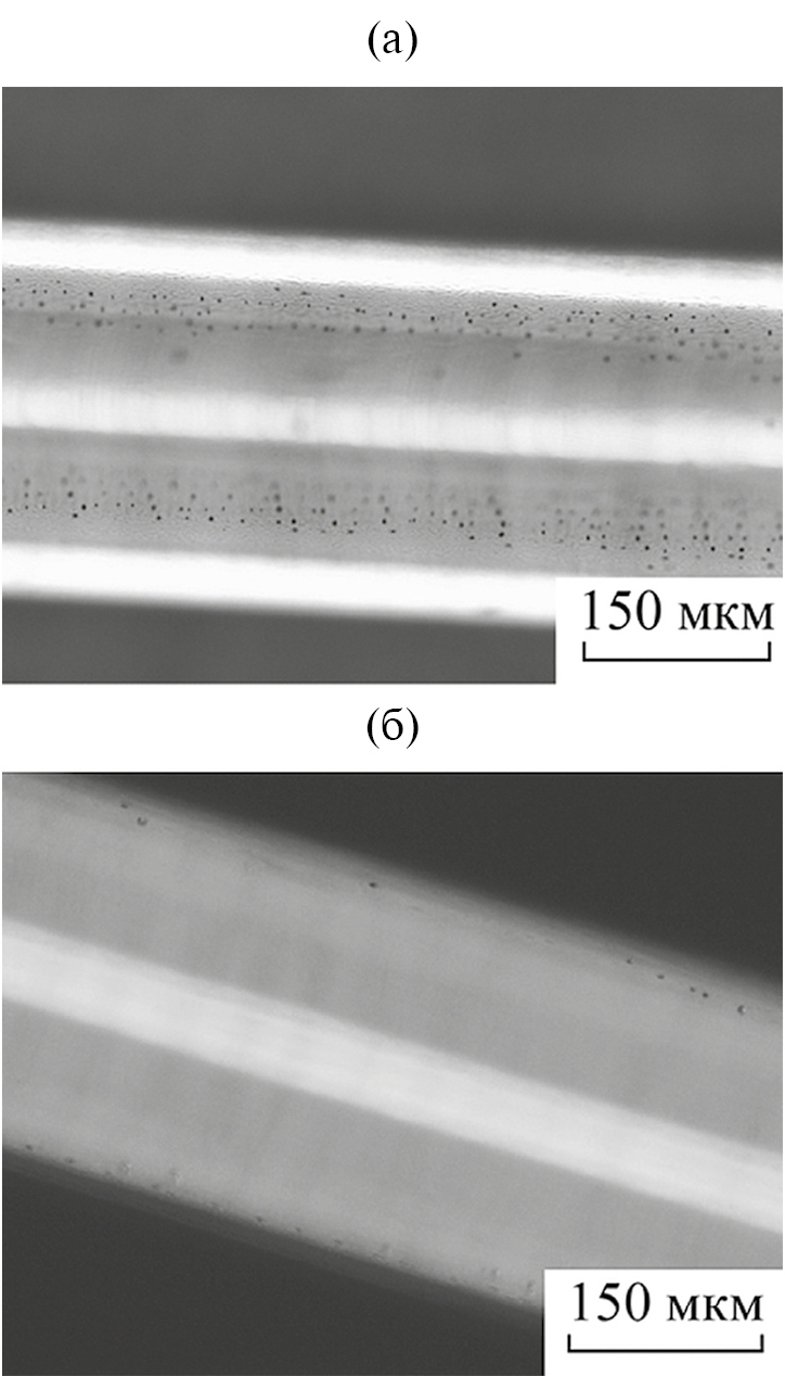 Выращивание волокон методом Степанова/EFG может сопровождаться образованием как объемных, так и поверхностных дефектов, которые оказывают влияние на механические и оптические характеристики сапфировых волокон. Дефекты в виде газовых включений размером 1–5 мкм (рис. 3) образуются в результате захвата кристаллом выделяющихся из расплава растворенных газов и концентрируются в основном в приповерхностном слое волокна. Их размеры и количество, прежде всего, зависят от скорости вытягивания волокон. Относительно большие скорости сопровождаются увеличением высоты столба расплава над рабочей кромкой формообразователя, что приводит к снижению температурного градиента в расплаве и увеличению переохлаждения в объеме мениска расплава. Переохлаждение (в первую очередь – концентрационное), возникающее при высоких скоростях выращивания, ведет к морфологической неустойчивости положения фронта кристаллизации и массовому захвату газовых включений, снижающих прочность волокон. При уменьшении скорости вытягивания количество газовых включений снижается.