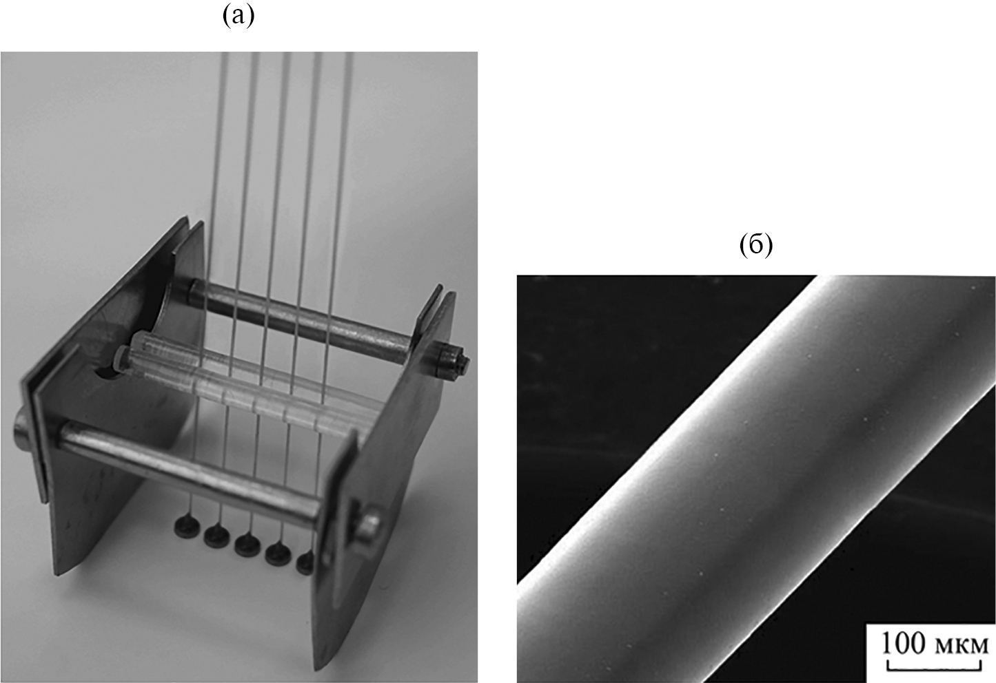 Для снижения шероховатости разработана система стабилизации диаметра волокон в процессе их выращивания. Принцип работы системы стабилизации волокна состоит в принудительном контакте выращиваемых волокон с двумя сапфировыми валками, расположенными на высоте 20–50 мм от рабочего торца формообразователя (рис. 5а). Волокна пропускают между сапфировыми валками диаметром 4–7 мм, которые могут свободно перемещаться в желобе молибденовой подставки и за счет своего веса несколько зажимают волокна между собой, что обеспечивает возможность беспрепятственного прохождения волокон между валками и предотвращение их колебания (и, как следствие, изменение поперечного сечения и шероховатости) в зоне контакта с мениском расплава на рабочем конце формообразователя. Сапфировые валики выступают здесь в качестве демпфера точки фиксации волокон, что существенно снижает амплитуду их колебаний и, как следствие, повышает качество поверхности сапфировых волокон (рис. 5б) [16].