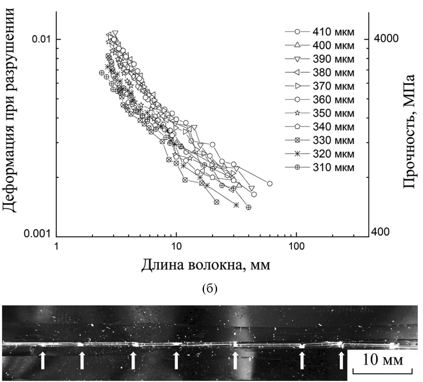 Рис. 7. Результаты испытаний партии волокон: зависимости предельной деформации при разрушении и прочности волокон от длины и диаметров поперечного сечения (указано в поле графика) (а); волокно после испытаний (б), стрелками показаны изломы волокон.