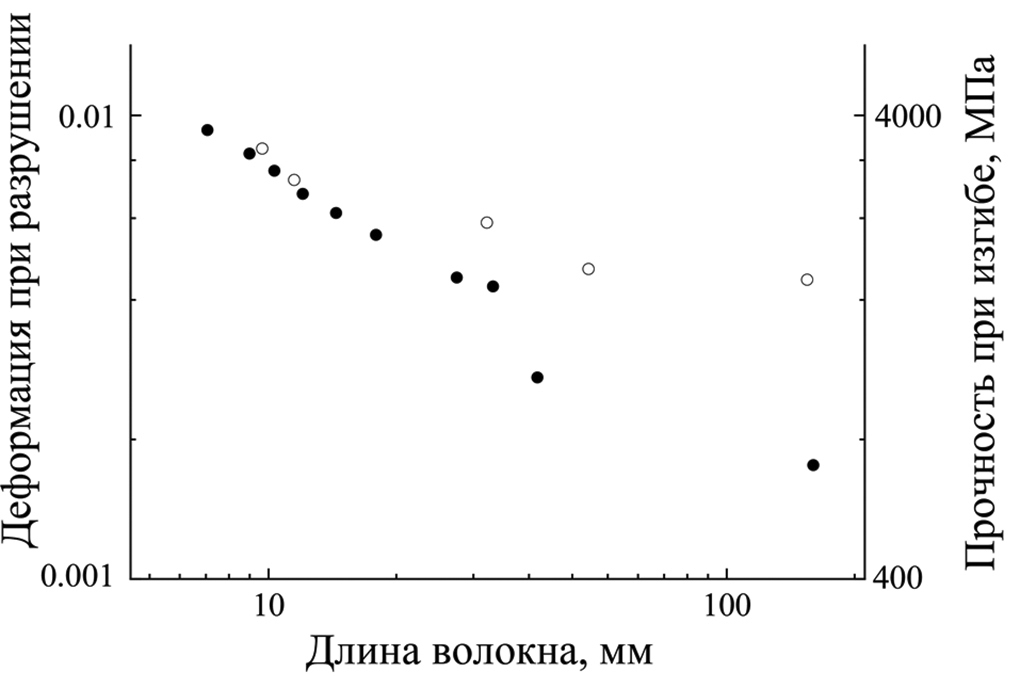 Рис. 8. Зависимости предельной деформации и прочности волокон от длины обычного волокна (●) и волокна, выращенного с устройством для стабилизации диаметра (○).