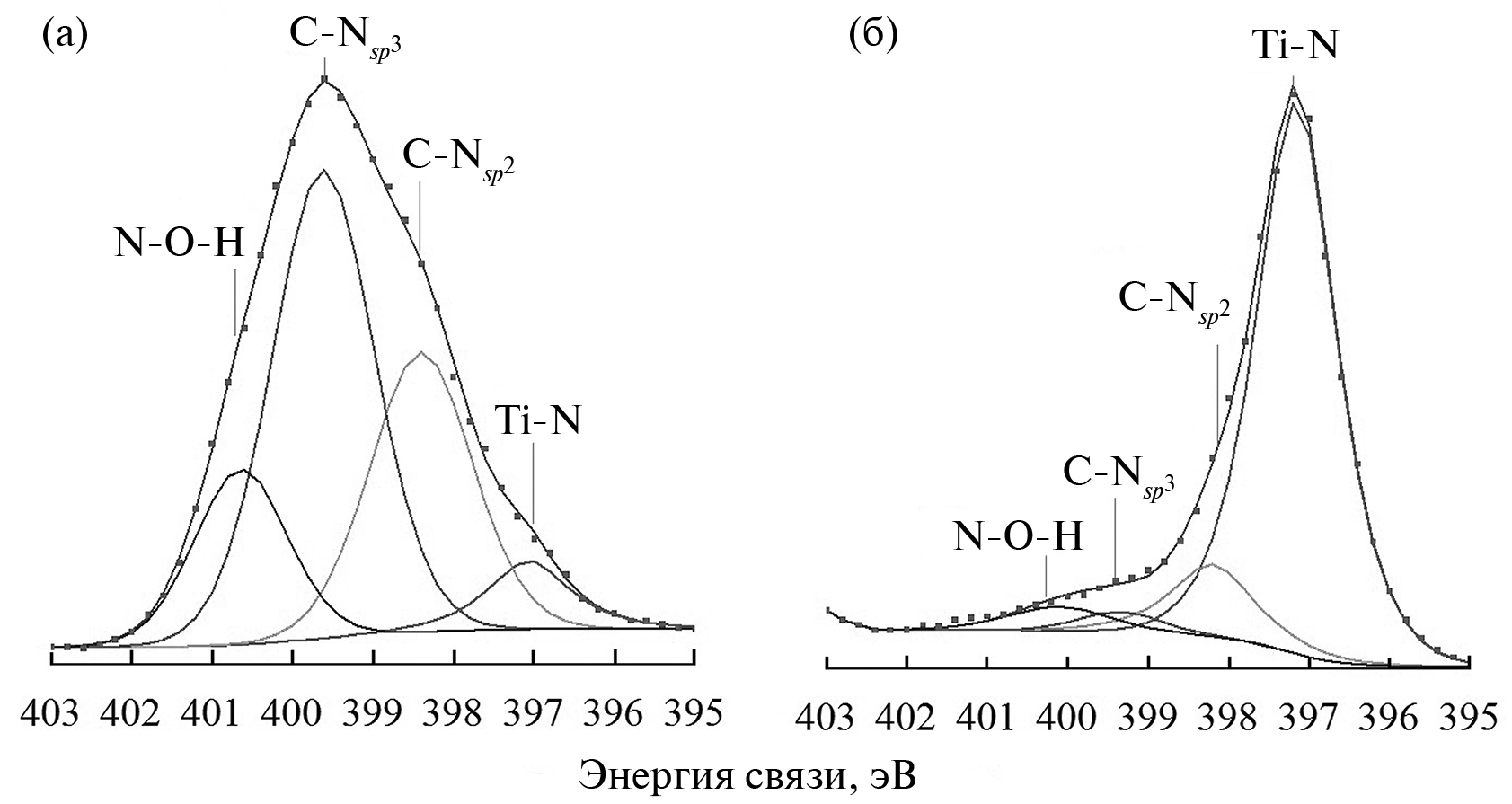 Анализ РФЭ-спектров N1s (рис. 3) показал, что после термического воздействия образование соединений титана с азотом, характерных для нитридов титана, начинает проявляться также практически с поверхности. Об этом свидетельствует пик с энергией связи 397.1 эВ на спектре N1s [18, 22], полученного с поверхности после травления ионами аргона на глубине порядка 1 нм (рис. 3а). Преобладающие же состояния атомов азота на этой глубине приходятся на C–N-связи с sp2 - и sp3-гибридизацией валентных электронов. По всей видимости, это состояние атомов азота из замещающих позиций атомов углерода в углеродной пленке. Однако следует отметить, что при приближении к переходной области пленка/подложка, например, на глубине порядка 40 нм, состояние атомов азота, находящихся в соединениях с титаном, является преобладающим (рис. 3б), что свидетельствует о том, что практически вся концентрация азота на этой глубине расходуется на образование нитридов титана.