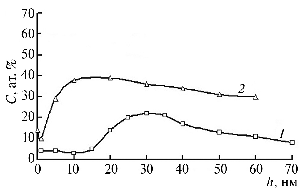 Отмечаемые выше уменьшения интегрального содержания углерода и азота в образце после термического воздействия можно объяснить следующим образом. Углерод при достаточно высоких температурах в атмосфере кислорода или азота вступает в реакцию горения с образованием летучих соединений СО, СО2 или (СN)2 [23]. По всей видимости, при термическом воздействии кислород из остаточной атмосферы вакуума и из переходной области взаимодействует с углеродом из слоя с преимущественной концентрацией, а также с углеродом и азотом из переходной области, образуются соединения СО, СО2 и (СN)2, которые покидают поверхность образца, уменьшая концентрацию углерода и азота.