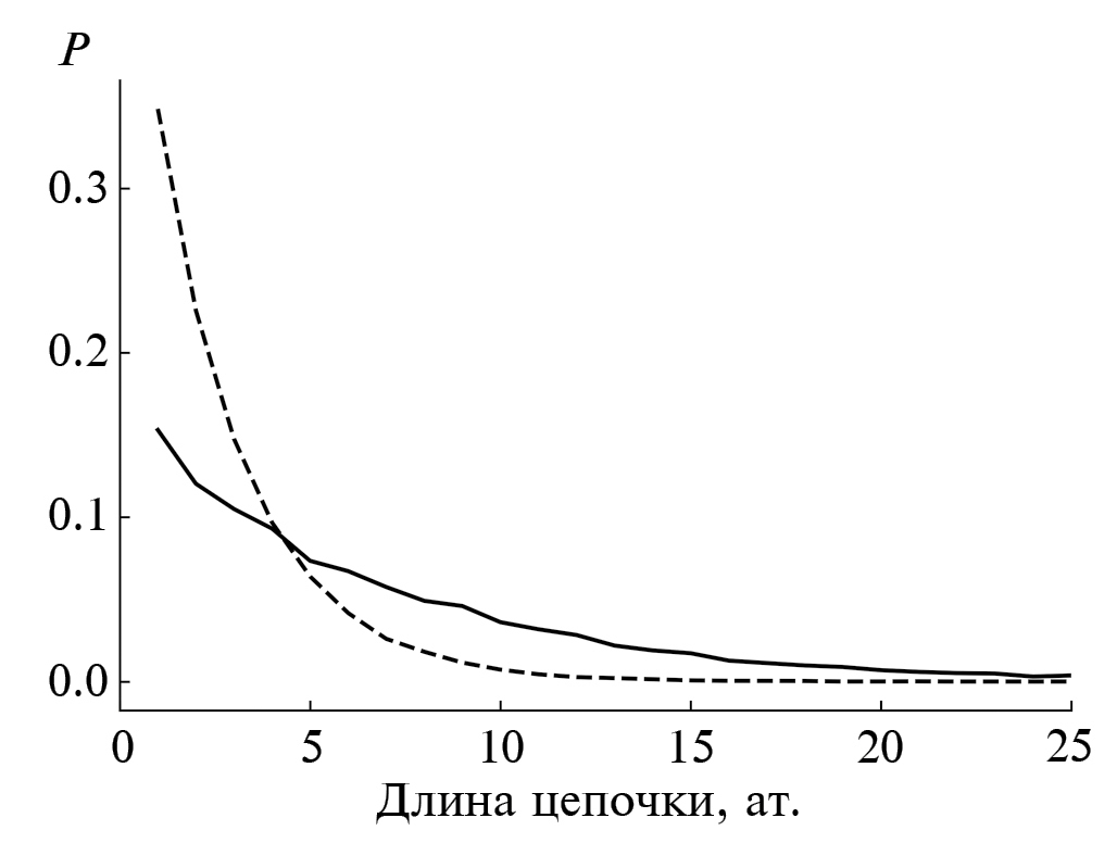 С температурой поверхности вид равновесного распределения длин цепочек изменяется: при росте температуры средняя длина цепочки также возрастает, а относительная доля мономеров снижается по сравнению с состоянием при низкой температуре. В то же время характерный вид распределения сохраняется (рис. 2).
