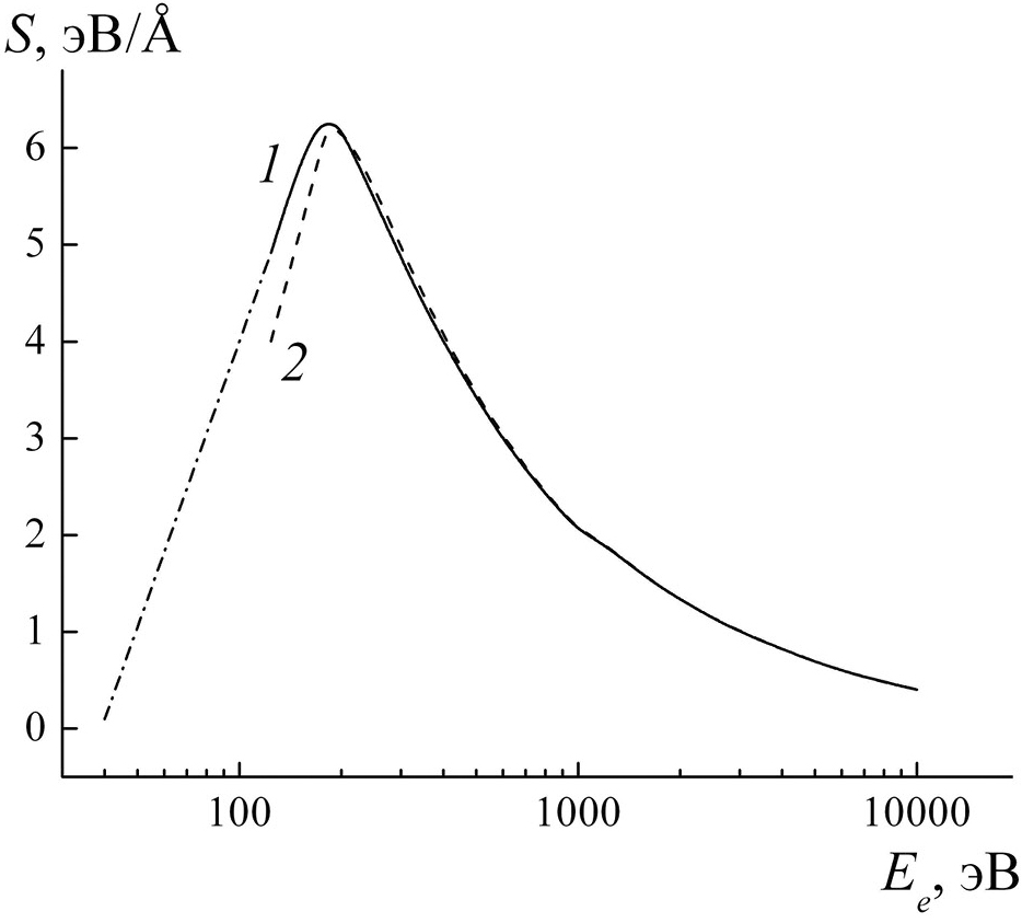 Транспорт электронов в однородной среде описывается методом Монте-Карло [24]. Рассмотрим падение электрона с энергией Ee по нормали к поверхности на мишень толщиной d. При прохождении быстрого электрона через тонкий слой мишени потери энергии пропорциональны ее толщине. При прохождении одного атомного слоя (d = 1–2 Å) удельные потери энергии S(Ee) электрона с энергией Ee > 200 эВ в единицах эВ/Å от толщины этого слоя не зависят (рис. 4). Это позволяет использовать S(Ee) в расчетах энергии электрона Ee при его транспорте в однородной среде.