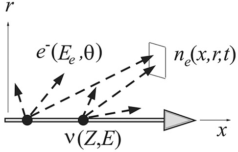 Быстрый ион с зарядом ядра Z и энергией E в момент времени t0 падает по нормали к поверхности бесструктурной мишени из кремния толщиной d. Направим ось ОX вдоль нормали. Из аксиальной симметрии следует, что количество электронов, проходящих через любую плоскость, перпендикулярную скорости иона, можно описать функцией n(x, r, t), где x – глубина слоя, r – радиальная координата, t – время. Будем считать, что электрон с энергией E0 в отсутствие внешних электрических и магнитных полей в результате многократного рассеяния на атомах движется из точки с координатами (x0, r0) под углом θ по отношению к скорости иона по прямолинейной траектории со скоростью Ve(t):
