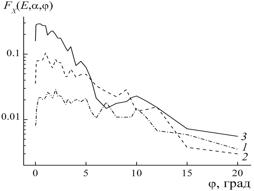 Коэффициент отражения электронов слоем горизонтально ориентированных УНТ зависит от углов α и φ (рис. 3). Немонотонность этой зависимости в виде нескольких максимумов в области углов φ < 15° объясняется чувствительностью результатов расчета к рельефу поверхности при отклонении плоскости рассеяния от выделенного направления УНТ. Самое большое количество отраженных электронов приходится на область φ = 2°–3°. Уменьшение коэффициента FX(E, α, φ) при φ → 0 объясняется уменьшением эффективной толщины стенки УНТ при первом неупругом столкновении с ней падающего электрона. Это приводит к увеличению вероятности проникновения электрона во внутреннюю часть УНТ и, как следствие, уменьшению коэффициента отражения FX(E, α, φ). Другие максимумы в распределении на рис. 3 можно интерпретировать как “отклик” на перераспределение потоков электронов в поверхностном слое мишени вследствие присутствия соседних УНТ. При уменьшении угла падения α количество таких дополнительных максимумов увеличивается, а отличие амплитуд соседних пиков становится меньше.