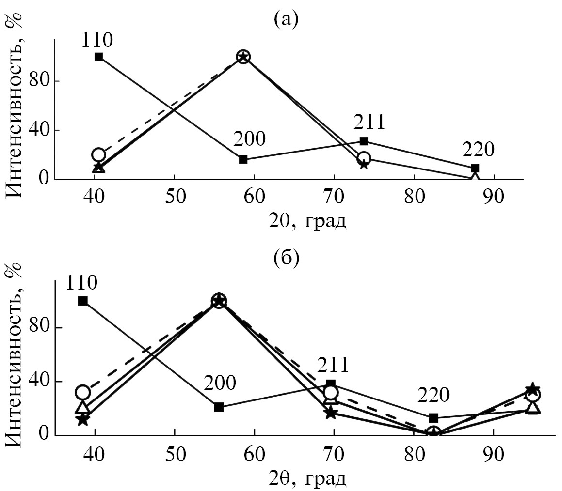 Рис. 3. Интенсивность рентгеновских рефлексов 110, 100, 211 и 220 в текстурированных фольгах Мо (а) и Та (б): ■ – литературные данные, изотропный образец; 𝝙 – облученная сторона фольги; Ο – облученная сторона после отжига 700°С; ★ – тыльная сторона после отжига 700°С.