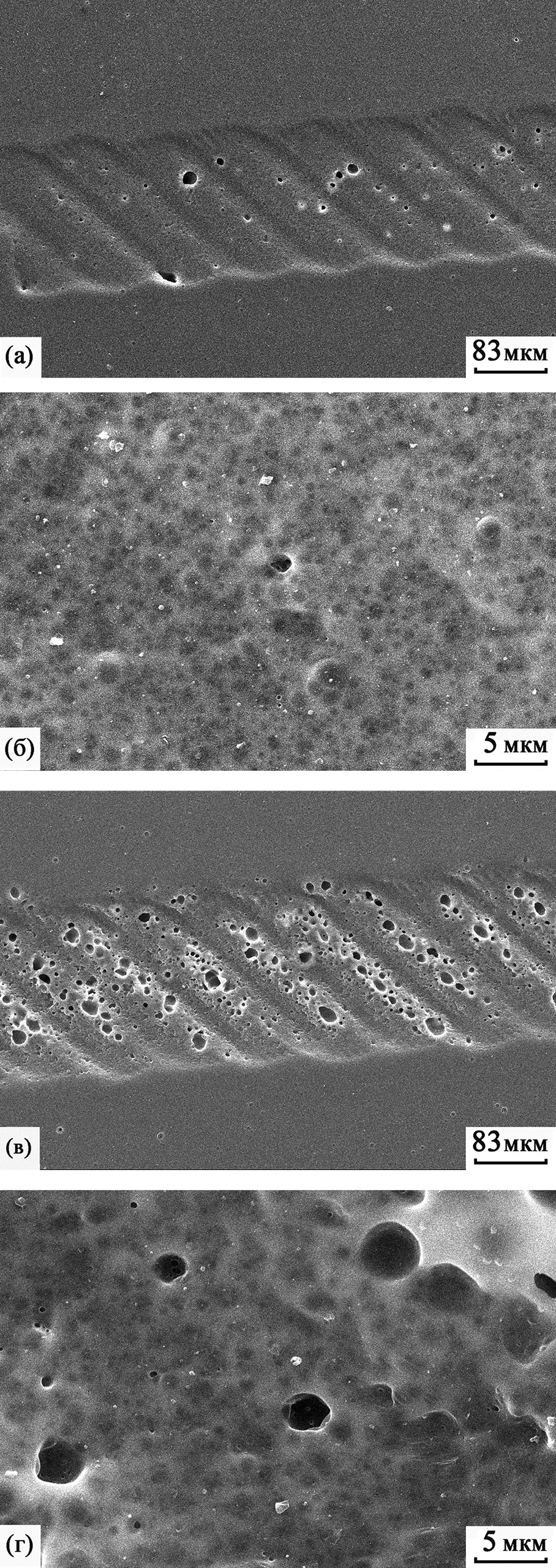 Рис. 1. РЭМ-изображение поверхности чистого ХПВХ после предварительной лазерной обработки (а, б –линия 2, в, г –линия 3) и однократного облучения МИП с плотностью тока 150 А/см2.