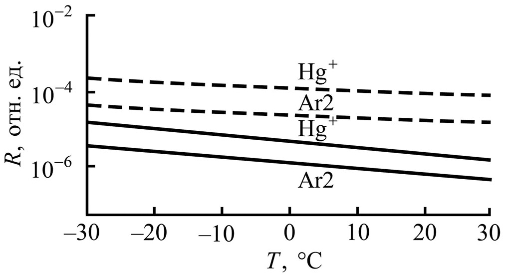 Напряжение зажигания в значительной степени определяется процессами ионизации рабочего газа в разрядном объеме и эмиссии электронов с катода. В смеси аргон–ртуть существенный вклад в ионизацию газа наряду с ионизацией атомов электронами может давать ионизация атомов ртути при столкновениях с метастабильными возбужденными атомами аргона (реакция Пеннинга) [8–10]. Это обусловливает увеличение напряжения зажигания разряда при снижении температуры окружающей среды из-за уменьшения концентрации паров ртути в смеси.