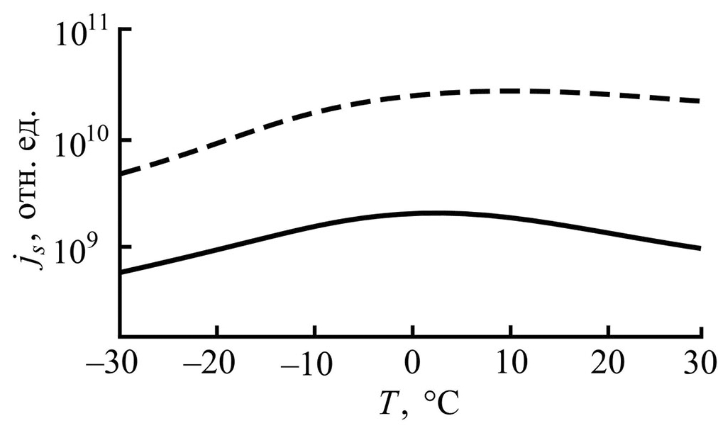 Рис. 4. Зависимость от температуры плотности потока распыленных с катода атомов. Сплошная линия соответствует катоду с пленкой, а штриховая – без пленки.