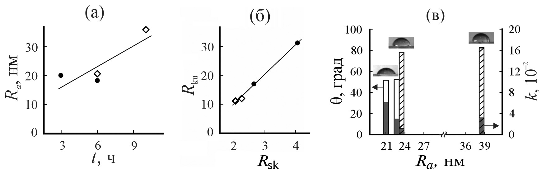 Рис 2. Корреляция между топографическими параметрами, смачиваемостью и условиями пассивного (сплошные символы) и ионно-ассистируемого (пустые символы и штриховка) осаждения тонких пленок сплава Al–1.5 ат. % Fe на стеклянную подложку, зависимость: а – среднеарифметической шероховатости Ra от времени осаждения покрытий; б – островершинности Rku от асимметричности Rsk профиля; в – краевого угла смачивания θ и гибридного коэффициента k от среднеарифметической шероховатости пленок. Показана форма капель дистиллированной воды на поверхности пленок. Эмпирические значения коэффициентов уравнения y = ax + b и COD (R2) при аппроксимации данных: a = 2.38 ± 1.05, b = 11.58 ± 7.1, COD = 0.72 (а); a = 9.95 ± 0.40, b = –9.60 ± 1.15, COD = 1.0 (б).