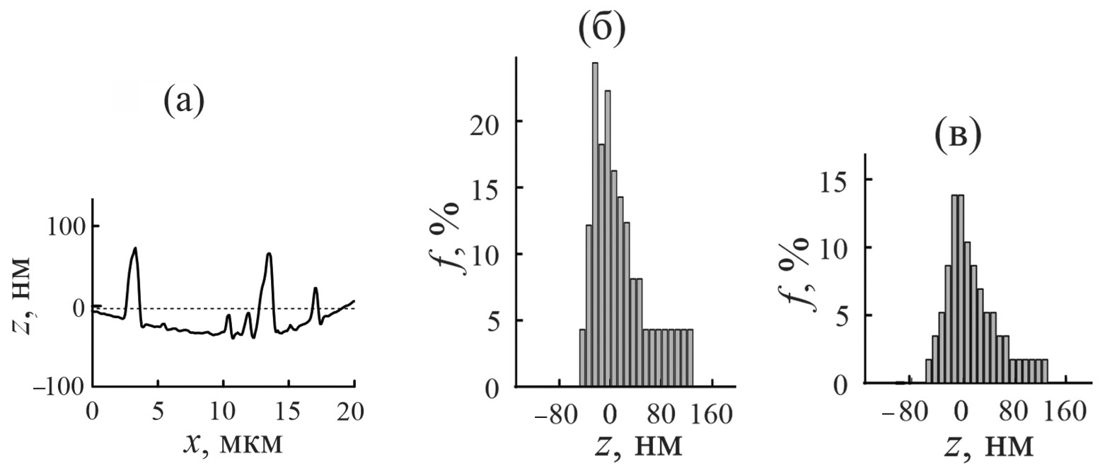 Рис. 3. К анализу АСМ-изображений тонких пленок сплава Al–1.5 ат. % Fe, осажденных на стекло: профиль поперечного сечения нанорельефа вдоль линии сканирования на рис. 1в (а); аналитически рассчитанные гистограммы распределения высот/впадин нанорельефа для профиля поперечного сечения (б) и всей поверхности пленки (в) на рис. 1в. Значения Ra, измеренные аналитически, а также значения σ, σ1/σ2: б – 14.92 нм, 28.89, 1:4.2; в – 21.92 нм, 29.80, 1:2.5.