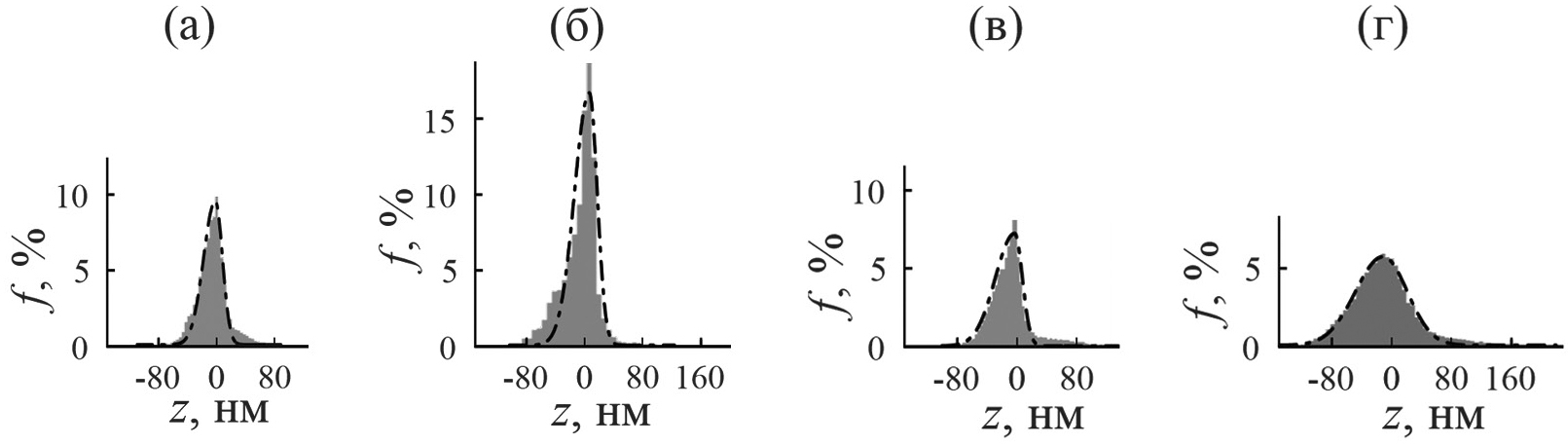 Рис. 5. Сравнение экспериментальных гистограмм распределения высот/впадин нанорельефа поверхности тонких пленок сплава Al–1.5 ат. % Fe на стекле, полученных в режимах пассивного (а, б) и ионно-ассистируемого при U = 3 кВ осаждения (в, г) в течение 3 (а), 6 (б, в) и 10 ч (г), с аппроксимирующими кривыми двойной функции Гаусса с общим центральным значением (штрихпунктир).
