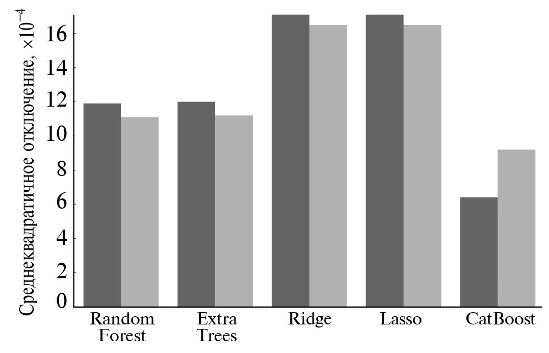 Рис. 6. Величина среднеквадратичной ошибки предсказания спектров XANES используемых моделей машинного обучения на тренировочном (темно-серым) и проверочном (светло-серым) подмножествах данных.