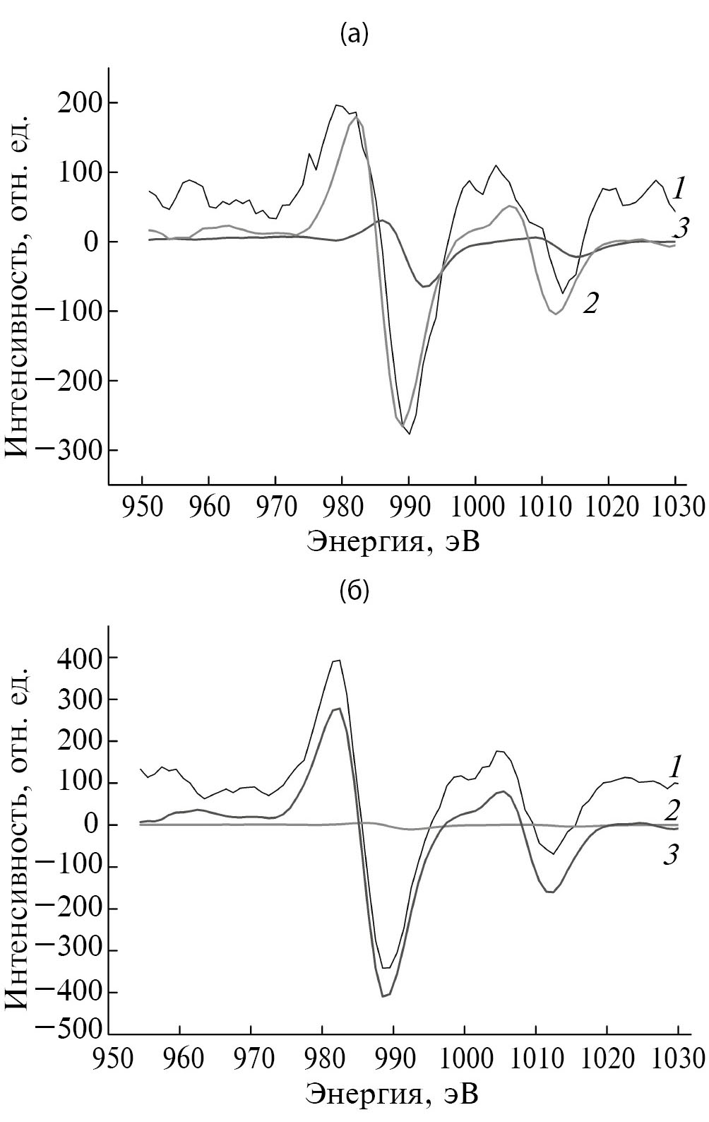 Рис. 3. Деконволюция экспериментального дифференциального оже-пика Zn (1) эталонными спектрами Zn (металлического) (2) и ZnO (3) для имплантированного образца (а) и после отжига при 700°С (б).