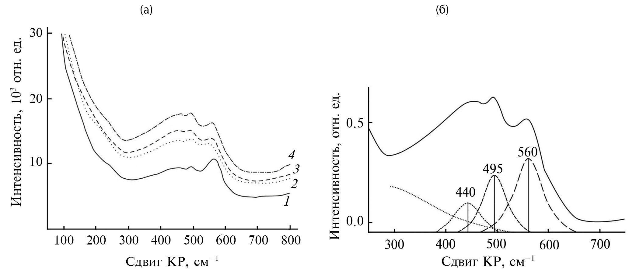 Рис. 4. Спектры КРС пленки оксида кремния, имплантированного Zn: а – после имплантации (1) и отжига при 400 (2), 600 (3) и 800°С (4); б – разложение спектра 4 на составляющие.